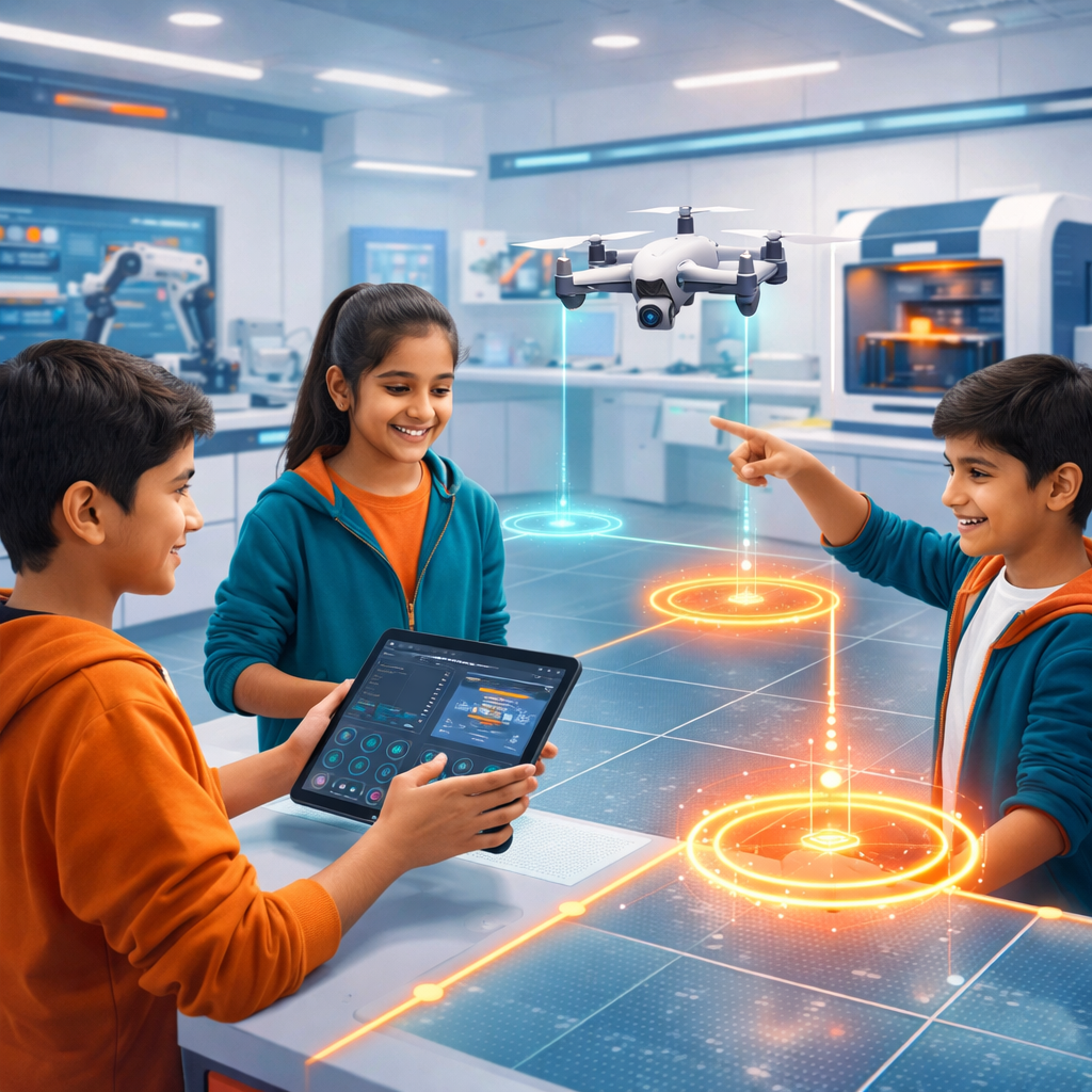 Drone activities are guided and age-appropriate. The focus is on controlled mission-based exploration, not unsupervised flying.